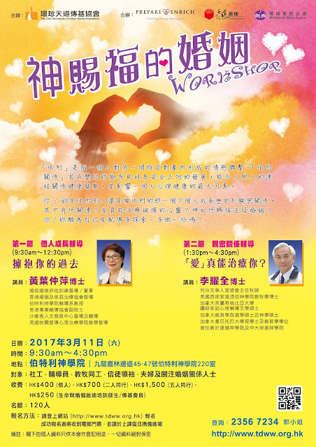 收費:HK$400 (個人)、HK$700 (二人同行)、HK$1,500 (五人同行)、HK$250 (生命與婚姻啟迪培訓師生/傳基會員/神學生)
